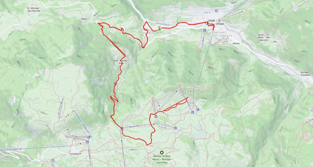 All'inizio si imbocca la pista ciclabile che da Ortisei scende verso sud e svoltiamo a sinistra verso Strada Passua e iniziamo subito a sentire la salita.