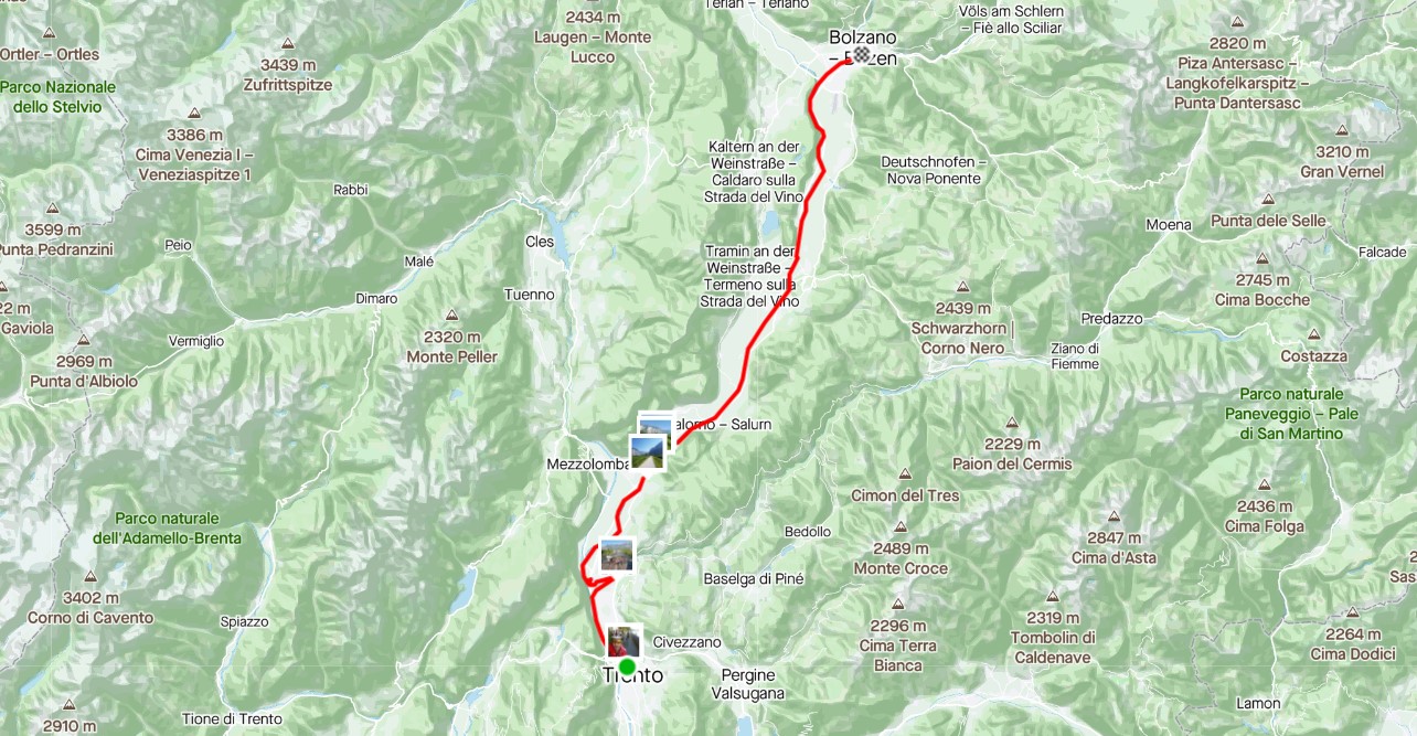 Questa terza tappa ci porta da Trento a Bolzano, viaggiando completamente su pista ciclabile in sede separata dalle strade.
