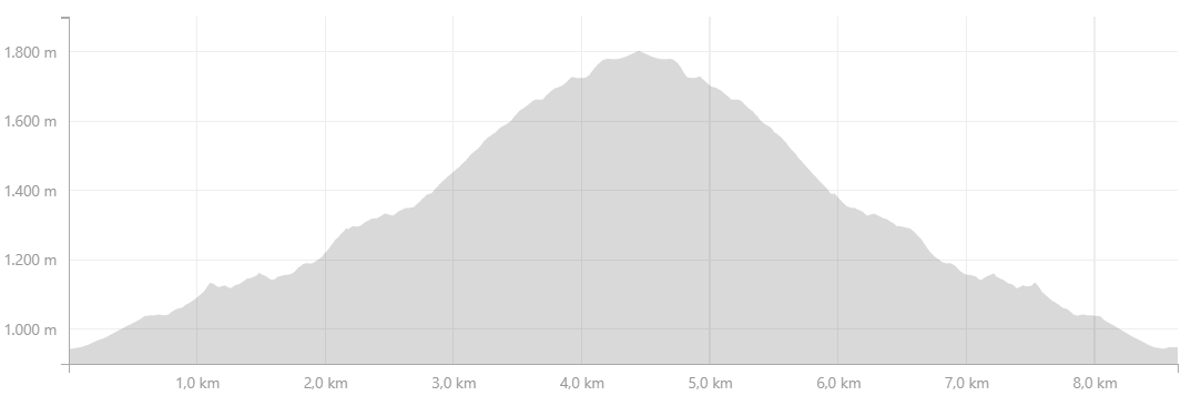 La salita molto tosta e gli altifusti fanno credere di essere in alta montagna, invece siamo abbondantemente sotto i 2000m. Si parte dai 912m s.l. del rifugio e si arriva a 1828.