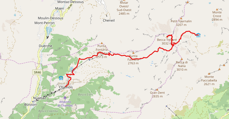 Arrivati a Chamois è il comune più alto della Valle d’Aosta ed uno fra i più alti d’Italia e da li si imbocca il sentiero verso Corgnolaz dove imboccheremo il sentiero 107 in direzione del lago di Lod. direzione rifugio Grand Tournalin.