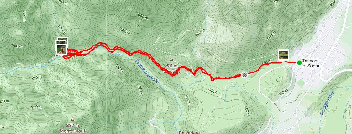 Si costeggia il fiume Meduna su un sentiero adatto a tutti, inizialmente è asfaltato, poi diventa cemento e solo alla fine ci troviamo su sterrato/brecciato.